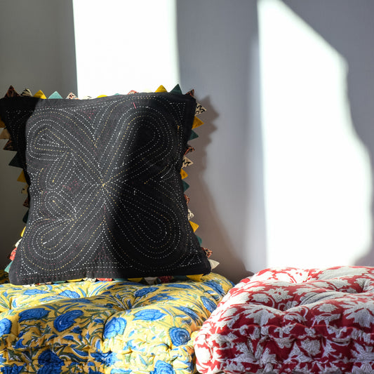 • mini tassle mirrorwork cushion cover