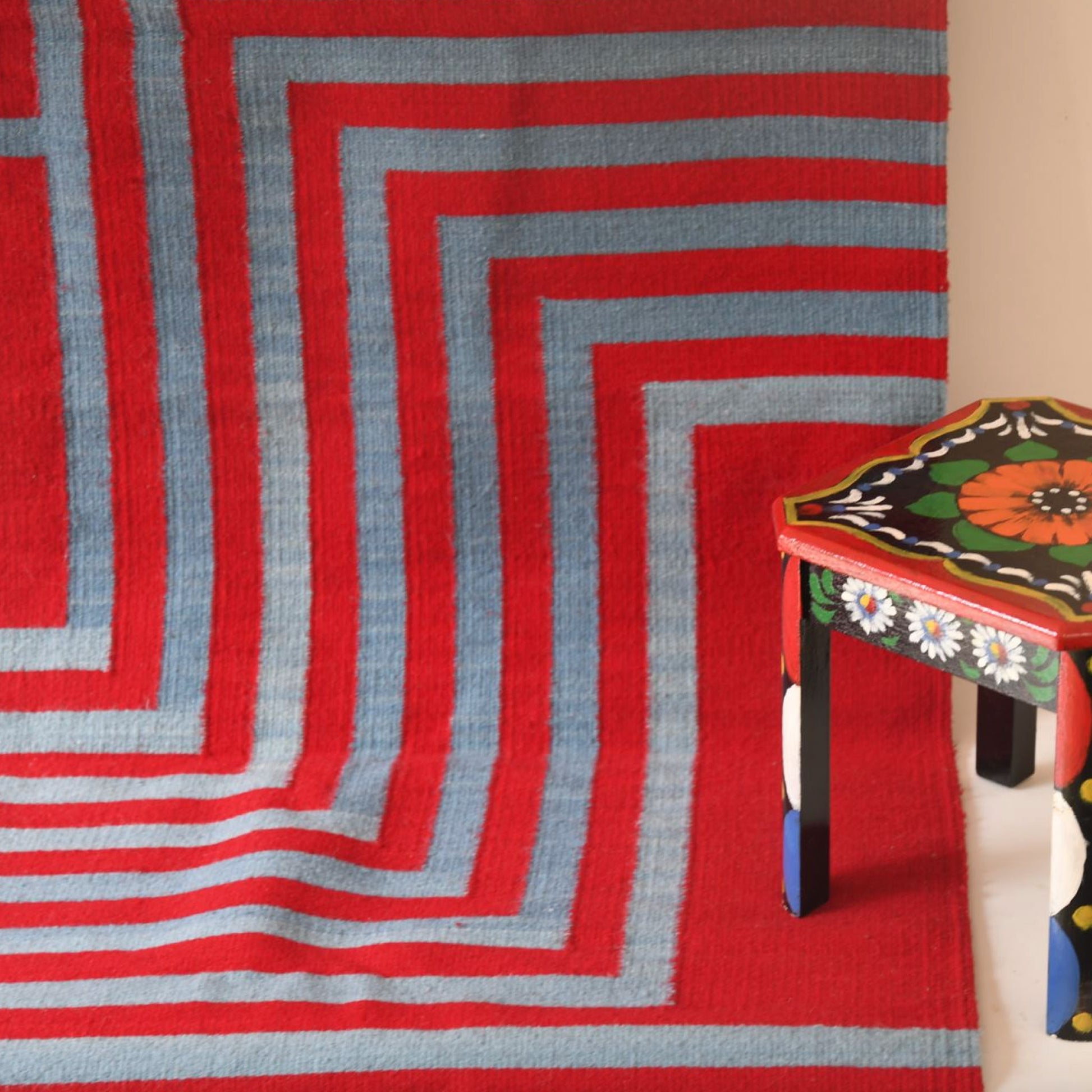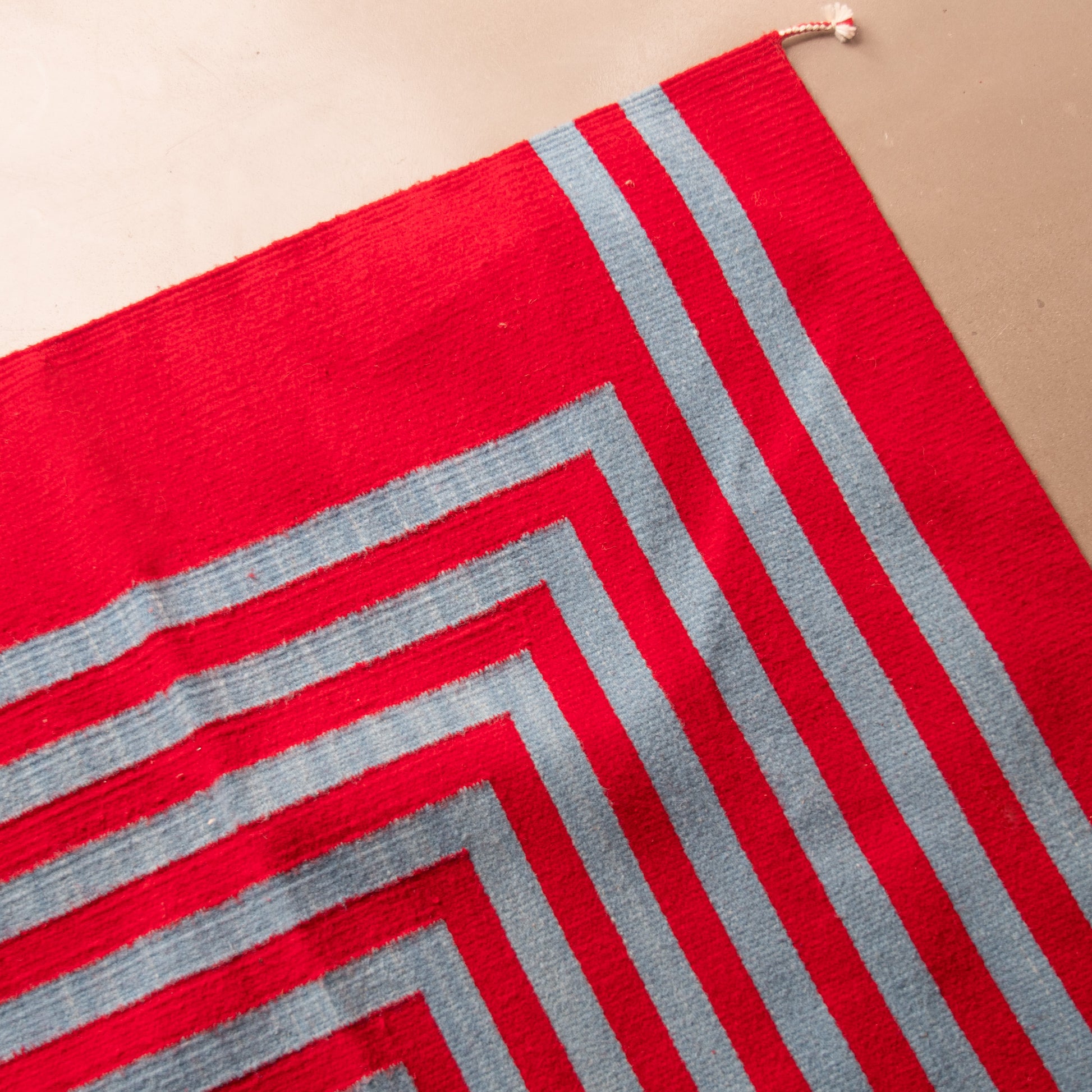 Un superbe tapis tissé à plat présentant un motif géométrique et des couleurs vives dérivées de l'indigo et de la cochenille, une teinture ancienne dérivée d'insectes mangeurs de cactus.